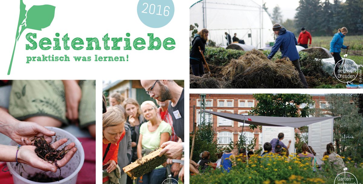 Unter dem Titel “Seitentriebe” konnten wir nun schon zwei Jahre in Folge die gemeinsame Veranstaltungsreihe des Gartennetzwerks durchführen, der Fokus liegt auf praktischem, niedrigschwelligem Lernen. Im Laufe der Saison möchten wir 15 praxisorientierten Workshops durchführen, bei denen wir gärtnerische Fähigkeiten und Kompetenzen vermitteln, zum Selbermachen anstiften, und Bildung für nachhaltige Entwicklung stärken. Die Altersspanne der insgesamt circa 500 TeilnehmerInnen aus dem ganzen Stadtgebiet ist weit gefächert, es nehmen teils aktive GemeinschaftsgärtnerInnen, teils Nachbarn, aber auch Interessierte teil, die vorher noch nie in einem Gemeinschaftsgarten waren. Die Workshops bieten die Möglichkeit für den Erstkontakt mit einem Gemeinschaftsgarten und andererseits hat die Reihe eine verknüpfende und vernetzende Wirkung auf schon engagierte Akteure. Die Veranstaltungen sind als mehrstündige und kostenfreie Wochenend-Workshops mit einem Fokus auf praktische Tätigkeiten angelegt, die ohne Anmeldung und Vorkenntnisse besucht werden können. Dadurch wird stellen wir sicher, dass die Teilnehmer möglichst vielen Menschen möglich ist. Der Erfolg der letzten Jahre und die positive Rückmeldungen zahlreicher TeilnehmerInnen und die zunehmende Vernetzung innerhalb des Netzwerks bestätigen uns im grundsätzlichen Ansatz unserer Veranstaltungsreihe. Die Seitentriebe als Veranstaltungsreihe eines offenen Netzwerkes kann nur auf Grundlage zahlreicher Kooperationen funktionieren. Auch für 2016 ist es uns gelungen, zahlreiche Partner zu finden. Darunter sind das Umundu-Festival Dresden, die Stories of Change (Filmprojekt zu lokalen „Geschichten des Wandels in Dresden“), der Streetfood Mark Dresden, die Permakultur-Akademie und weitere. Dazu kommen mehr als zehn Gemeinschaftsgärten als gastgebende Lernorte. Die GärtnerInnen finden so ganz praktisch den Weg zueinander und in andere Gärten; außerdem übernehmen die Projekte die Veranstaltungsbetreuung vor Ort und werden dadurch aktiv ins GartenNetzwerk eingebunden.