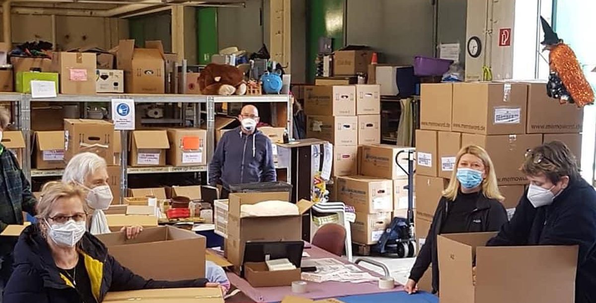 In 2020 haben wir Sachspenden im Wert von geschätzt mehreren hunderttausend Euro an Bedürftige weitergeben können. In unserem Kleiderladen, an unsere circa 80 Netzwerkpartner in der Umgebung (z.B. Tafeln, Helferkreise, Ankerzentren, Behinderteneinrichtungen, Frauenhäuser, Aidshilfe, Kinderhospize usw.) oder durch Hilfslieferungen per LKW nach Moria, Rumänien oder in den Irak. Insgesamt verteilten wir 450 Paletten mit Hilfsgütern, darunter 700 Weihnachtspäckchen für Kinder in Flüchtlingslagern.