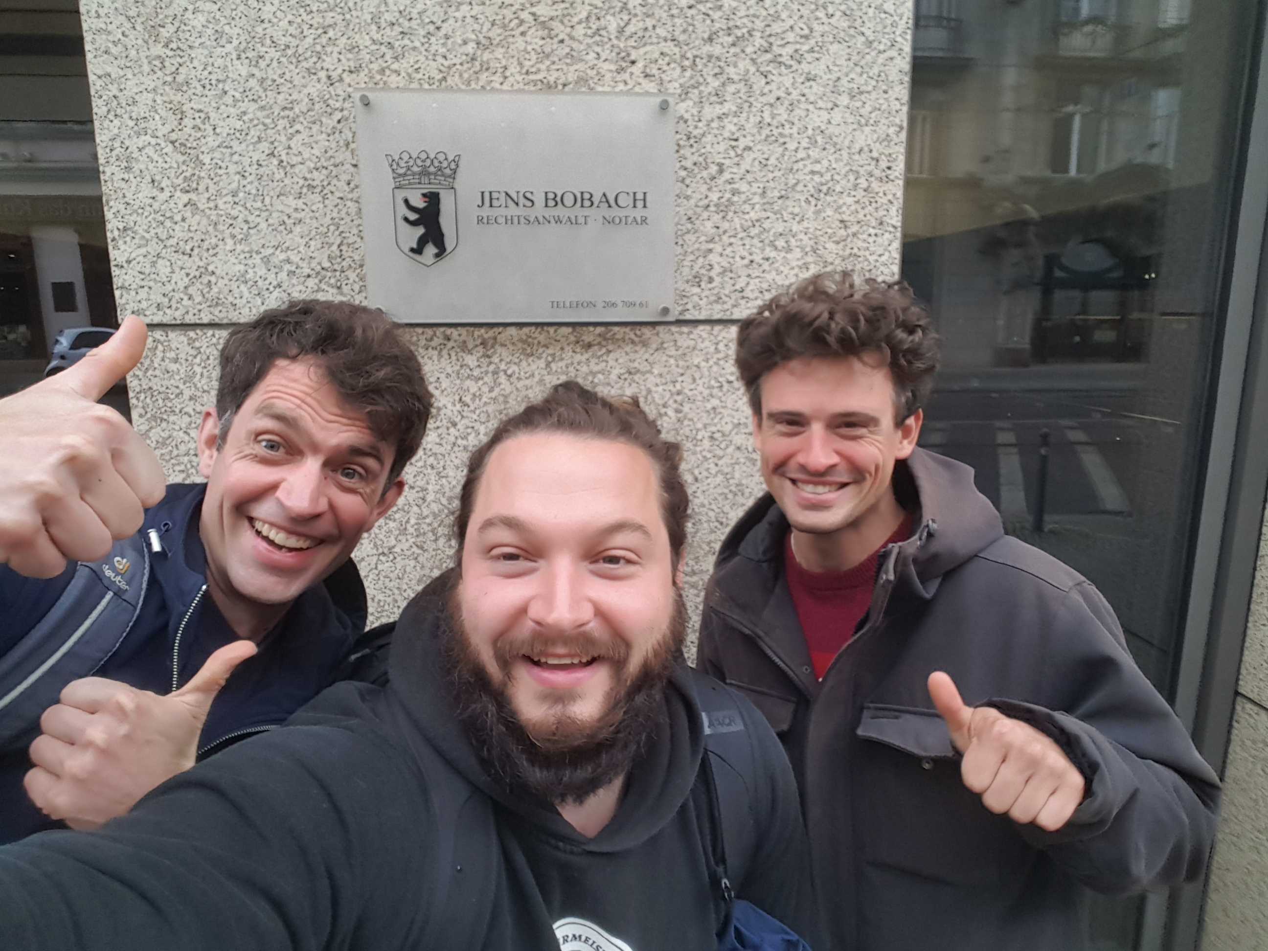 Sebastian Jacob (Gründer von Quartiermeister) und die beiden Geschäftsführer David Griedelbach und Peter Eckert bei der Eintragung der neuen Quartiermeister Stiftung gUG im Mai 2021