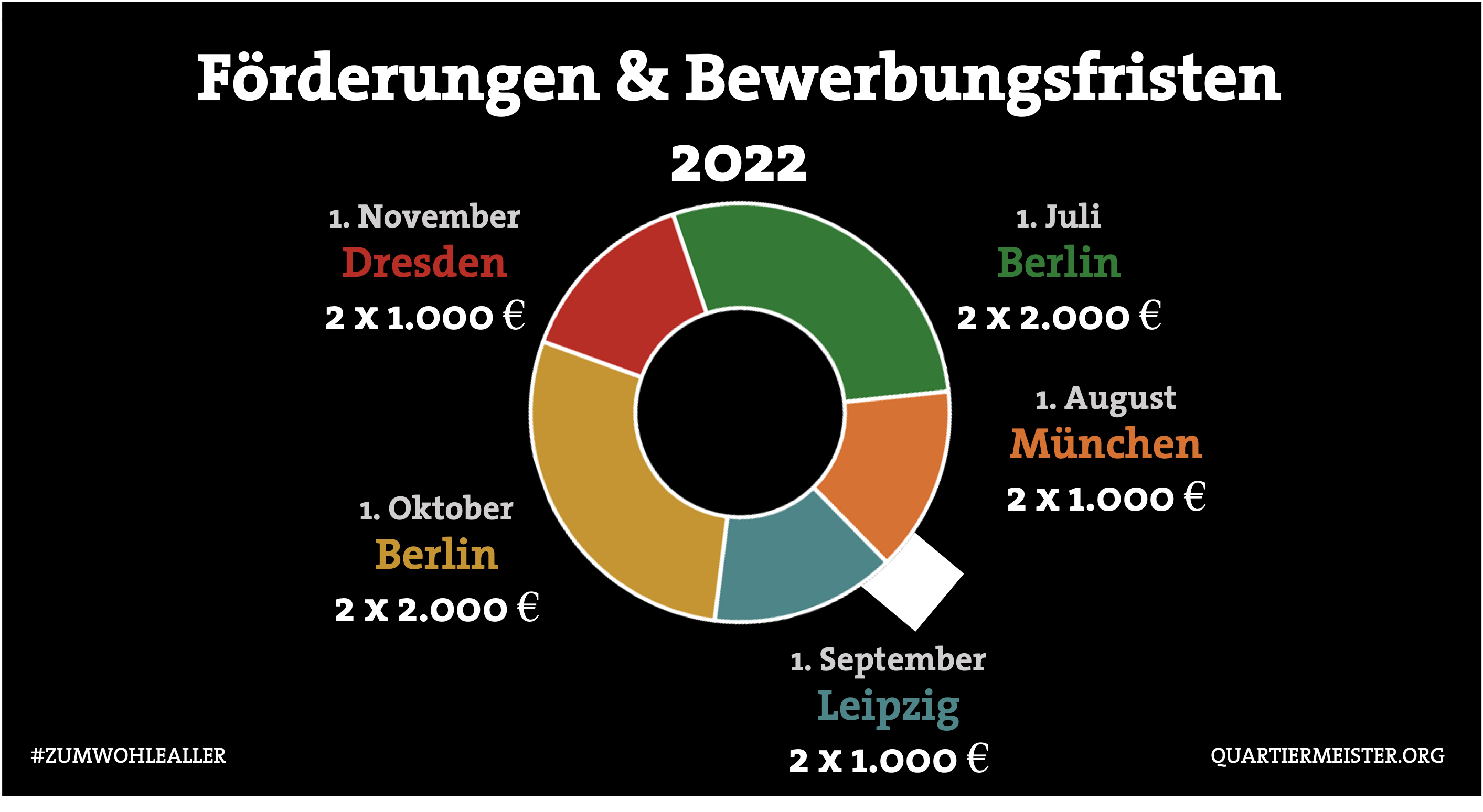 Ihr kennt soziale Projekte, die Lust auf niedrigschwelligen Support haben oder möchtet selbst von Quartiermeister gefördert werden? Ab sofort ist es möglich, sich einfach und online auf unsere Förderung in den jeweiligen Städten zu bewerben! Hier findet ihr weitere Infos zu den Förderkriterien- und modalitäten. Wir freuen uns auf eure fantastischen Ideen für eine vielfältige und solidarische Nachbarschaft zum Wohle aller!