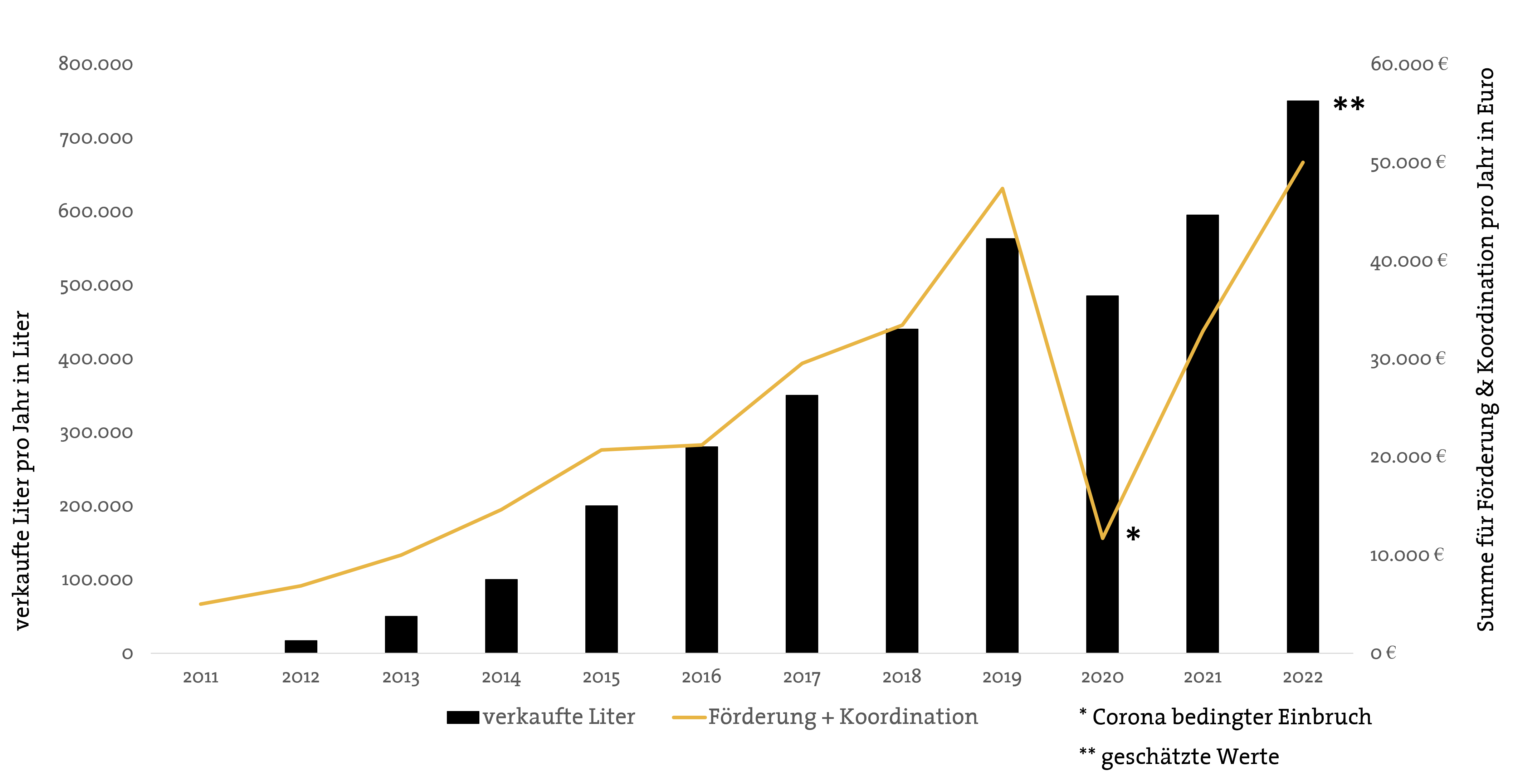Flashback: Bereits im April 2020 mussten wir aufgrund der Pandemie und den damit verbundenen Umsatzeinbußen unseren regelmäßigen Förderbetrieb einstellen. Daraufhin versuchten wir immer wieder, zur Normalität zurückzukehren. Wir förderten vereinzelt in neuen und alten Quartieren, besaßen jedoch kaum finanziellen Spielraum, um dort anzuknüpfen, wo wir 2020 aufgehört hatten. Die Krise führte uns vor Augen, dass unser Förderversprechen von 10 Cent pro Liter auf Dauer nicht nachhaltig ist. Deswegen suchten wir ein neues Förderkonzept, das es der GmbH erlaubt, selbst kostendeckend zu wirtschaften, ohne in Existenznot zu geraten. Denn Quartiermeister hat bisher nie nennenswerte Gewinne am Ende eines Jahres erwirtschaftet, aber trotzdem kontinuierlich gefördert. Die Schwächen dieser “knapp gestrickten” Finanzierung wurden während Corona besonders deutlich. Unser neues Förderkonzept sollte diesen Umstand vermeiden, aber ebenso unserem Prinzip gerecht bleiben, mit jeder einzelnen Flasche Gutes zu tun. Ganz schön verzwickt!