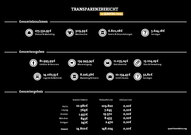 München hat mit 8.455 Litern im Vergleich zu Quartal 2 (5.356 Liter) ordentlich zugelegt und unser jüngstes Quartier Stuttgart geht mit 2.470 verkauften Litern auch gut ab (Q2 waren es 870 Liter). In allen Quartieren wurden insgesamt mehr als 140.000 Liter im dritten Quartal verkauft. 10 Cent pro Liter fließen in die lokale Projektförderung. Das ergibt dann also knapp 14.000 € sozialer Gewinn - nur durch Q3. Wir sind mächtig stolz und sehr glücklich über diese Zahlen. Danke, dass ihr Quartiermeister trinkt! Prost!